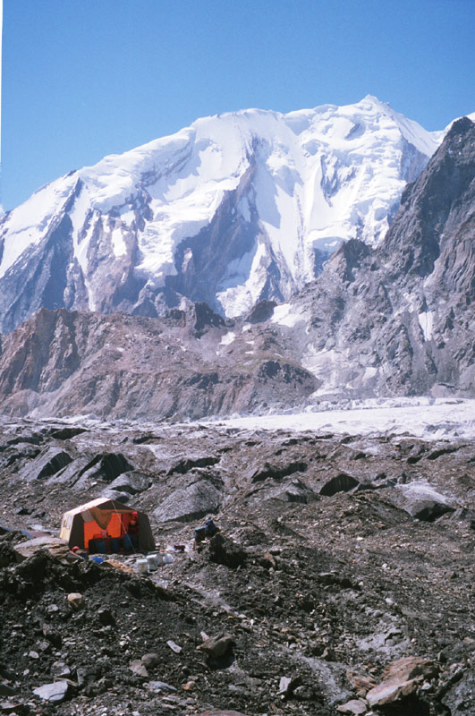 Горы и стихии предоставили нашей команде хорошие шансы на успех. Мы не встретили серьезных препятствий на всем протяжении гребневого маршрута. Хорошая погода позволила достичь вершины уже во время второго акклиматизационного выхода. Нам выпала счастливая возможность увидеть с высоты 7027 метров величественную панораму сверкающих гигантов: вблизи массивная Ракапоши(7788 м) — высшая точка района, на юге похожий на замок Нанга-Парбат, а на северо-востоке, у самого горизонта — широкая лопата Броуд-пика и несравненная, грозная пирамида К2. Может быть когда-нибудь, в следующей жизни…