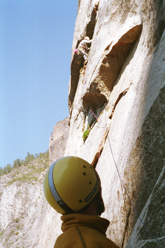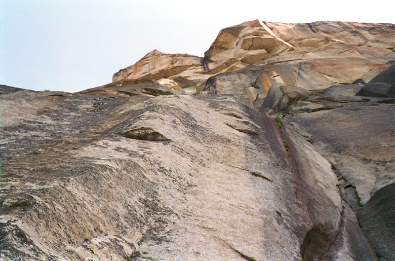 В мае 1997 нам удалось выбраться в Йосемиты на неделю. Целью наших коротких сборов было восхождение на Эль Капитан по маршруту Салатэ (VI, 5.10, А2, по-нашему – 6А). Маршрут действительно красивый. По сравнению с другими маршрутами на Эль Капитан выделяется относительно большим количеством участков, проходимых свободным лазанием, и относительно несложным ИТО. Немного о технических характеристиках маршрута: перепад высот – около 1 км; протяженность – 36 веревок (некоторые неполные); средний наклон – около 850; порода — гранит; рельеф – вертикальные щели, камины; через каждые 5-7 веревок – удобные полки для ночевок; все станции на шлямбурах, но на веревках чужого железа практически нет (кроме пары мест пробитых старыми крючьями); воды на маршруте нет. По стилю маршрут похож на маршруты в Асане. Только гора невысокая, в этом смысле есть аналогия с Крымом. Впрочем, если сравнивать с Крымом, то Эль Капитан это 5 крымских шестерок, которые надо пройти подряд и вытаскивая тяжелые рюкзаки (по мере подъёма рюкзаки заметно легчают, т.к. на старте они в основном заполнены водой).