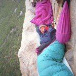 Вершинная башня заканчивается прекрасной полкой – лонг ледж. Приятно ступить на нее после 4 висячих станций. На снимке – утро после ночевки на лонг ледж. До вершины остается около трех веревок.